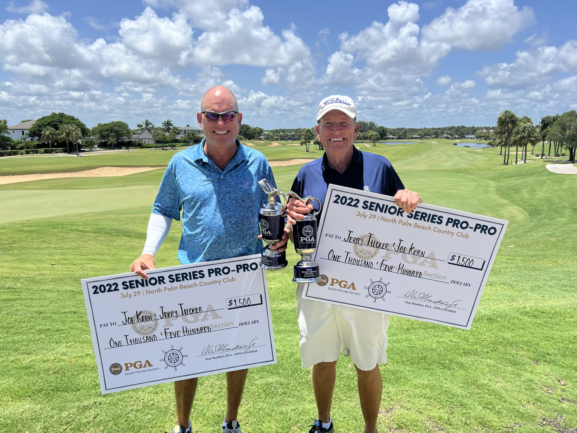 North Palm Beach (July 29, 2022)  – Joe Kern, PGA of The Moorings at Hawks Nest Golf Club and Jerry Tucker, PGA of Jerry Tucker Golf claimed victory this afternoon at the Senior Series Pro-Pro at North Palm Beach Country Club.
