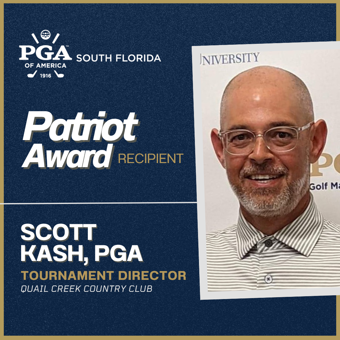 As Scott Kash tells the story, the Veterans he was teaching golf to that spring day in 2023 had it all wrong. There were 15 or so Veterans who had participated in a PGA HOPE (Helping Our Patriots Everywhere) class at Stoneybrook Golf Club in Estero, Florida, and during the ceremony held at the conclusion of the class, each of them walked up to Kash, one of the PGA of America Professionals who had served as an instructor that day. "Every one of them is coming up and thanking me," says Kash. "I'm thinking, 'I'm here to thank you.' That's when it hit me that what I'm doing is making a difference. It is truly the least that we can do, as golf professionals, to teach them the game and give back to those who put on the uniform so that we are able to do what we do every day." The passion that Kash has for providing various means for Veterans to start the game and continue to enjoy it is evident to anyone who knows the man who is truly making the most of his second career, which has now seen him honored with the 2025 South Florida PGA (SFPGA) Patriot Award. Kash is the sixth recipient of the Patriot Award, which recognizes a PGA of America member who personifies patriotism through the game of golf and demonstrates unwavering commitment and dedication to all who have served the United States of America. The SFPGA began recognizing the Patriot Award, one of the PGA of America's national awards, on the Section level in 2019. "This is a unique award, and I'm incredibly honored to receive it," says Kash, the Tournament Director at Quail Creek Country Club, a 36-hole private facility in Naples, Florida. "The Patriot Award is unique because it goes beyond what we do as a profession. I have looked at ways that I can give back, and when it comes to the military, I'm all in." Kash serves on the Home Base Golf Tournament Committee at Quail Creek. He played a vital role as the Tournament Director for the event itself, helping to raise more than $175,000 for the Home Base Foundation last year. Home Base is a national non-profit organization dedicated to healing the invisible wounds of war through direct clinical care, wellness, education, and research, all at no cost to Veterans, service members, and their families. As a PGA HOPE Certified Professional, Kash has successfully graduated 58 Veterans across four classes since 2023. Furthermore, as a leader for the PGA HOPE Basecamps in the SFPGA's Southwest Chapter, Kash has organized three additional sessions, offering enhanced instruction and playing opportunities to 30 Veterans. One of those whose lives Kash has touched is Ronald Dixon, a disabled Veteran and one of Kash's Player Development students. "I have experienced firsthand the patience, encouragement, and genuine care that Mr. Kash provides to those he mentors," Dixon wrote in a letter recommending Kash for the SFPGA Patriot Award. "Mr. Kash has gone above and beyond in supporting me not only as a student of the game but also as a Veteran navigating the challenges of recovery, growth, and transition ... His support has helped me grow both on the course and personally, reinforcing the sense of pride and confidence that military service instilled in me." As so many Veterans have discovered how golf can help change their lives, so too has the game enriched the second part of Kash's professional arc. After a career in manufacturing planning and logistics, Kash started playing more golf. A lot more ... upwards of 175 rounds per year, in fact. He went to work at a local municipal course in the New York City area, decided to dedicate his efforts to achieving PGA of America membership, and after helping his parents move to Southwest Florida, Kash became a PGA of America member in 2010. Kash said he "felt something that day" in Maine in 2016 when he assisted in one of the early PGA HOPE events, in Maine. Part of the pull, to wanting to help Veterans, emanated from thinking about his Dad, Gerald, who had served as a special enlisted reserve in Korea. "My Dad was my rock," he says now of his late father. The son went to it, and the fire for helping veterans continues to burn strongly. He is currently working with Home Base to establish a golf league for veterans. Through PGA HOPE Basecamps, which are designed to keep veterans engaged in golf, Kash has helped secure facilities and collaborated with other PGA HOPE Certified Golf Professionals to deliver five weeks of instruction, culminating in a final 9-hole scramble. This summer, the third Basecamp session that Kash oversaw featured eight returning participants who had previously attended at least one session. Heather Angell, also a PGA of America Professional, went through PGA HOPE training with Kash. "I ran four PGA HOPE Programs in Fort Myers, and Scott was with me every step of the way making sure the Veterans had a great experience," says Angell, the PGA Director of Instruction at The Golf Club at Fiddler's Creek in Naples, Florida. "When he asked me if I could assist him with a Basecamp he created and organized this year, I did not hesitate to help out, as I knew he was offering a meaningful experience for those Veterans who had already completed the original PGA HOPE Program. Scott saw the importance of the program and the need that the graduates wanted more. PGA HOPE has become his passion and the program in Southwest Florida has been elevated because of him." Paul Fitzpatrick, PGA Director of Golf at Babcock National Golf & Country Club in Punta Gorda, Florida, has worked with Kash on several Basecamp events and echoes the praise from Angell. "Scott's genuine care for veterans and passion for providing them with opportunities to improve their golf game and feel comfortable are always evident," says Fitzpatrick. "We organize Drive, Chip, and Putt challenges, as well as a 9-hole scramble. In addition, Scott has conducted multiple surveys to better understand the participants’ needs and enhance their overall experience. Scott has found his passion and is