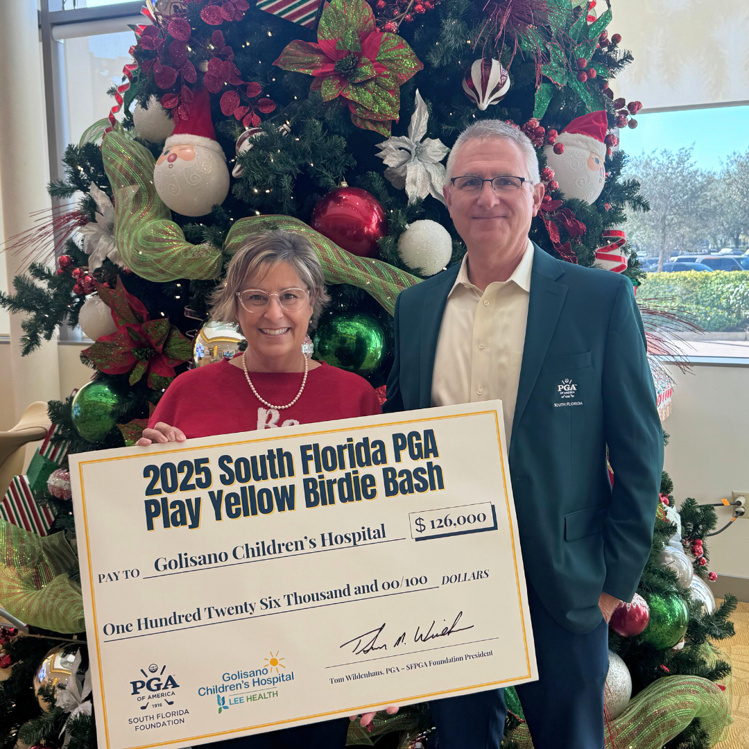 Fort Myers, FL – In the spirit of the holiday season, the South Florida PGA Foundation had the great honor of visiting Golisano Children’s Hospital on December 16th to present a check for $126,000. Each year, the SFPGA Foundation raises nearly $900,000 to support the local community through the game of golf. This contribution was made possible through the second annual West Coast Play Yellow Birdie Bash, held October 13th at The Glades Golf & Country Club in Naples, where PGA Professionals and supporters came together to make a meaningful impact for local families. The Birdie Bash is one of six major fundraising events conducted annually with the support of PGA Professionals across South Florida. This year’s check presentation brought together SFPGA Foundation Board Members, hospital leadership, patient families, and event participants to celebrate the Birdie Bash’s continued success and its growing impact on children’s healthcare in Southwest Florida. “The Play Yellow Birdie Bash is truly an amazing event,” said Toni Primeaux, Program Director at Golisano Children’s Hospital. “From the generosity of the PGA Professionals to the incredible support from their members, every dollar raised goes directly to helping children in our community. Seeing that level of passion and impact makes this event truly special.” During the 2025 Play Yellow Birdie Bash, 24 PGA of America Professionals competed in an 81-hole team challenge, with every birdie backed by pledged donations. The event raised more than $255,000, benefiting both Golisano Children’s Hospital and the SFPGA Foundation. Play Yellow, founded by Jack and Barbara Nicklaus in partnership with Children’s Miracle Network Hospitals, unites the golf community to support children’s hospitals across the country, helping the 10 million kids treated annually at CMN facilities. Donations to Golisano Children’s Hospital directly enhance its capacity to provide world-class pediatric care. As the only accredited children’s hospital between Tampa and Miami, Golisano continues to receive national acclaim, including multiple “Top Hospital” distinctions from The Leapfrog Group. Since 2022, the SFPGA has hosted six Birdie Bash events, four on Florida’s East Coast and now two on the West Coast. Collectively, these events have generated over $2.1 million to support youth, military personnel, and families throughout the region. The SFPGA Foundation is a non-profit organization dedicated to serving the South Florida community. Guided by the SFPGA and its 2,200 PGA of America Professionals, the Foundation leverages the game of golf to create meaningful opportunities and strengthen the communities it serves.